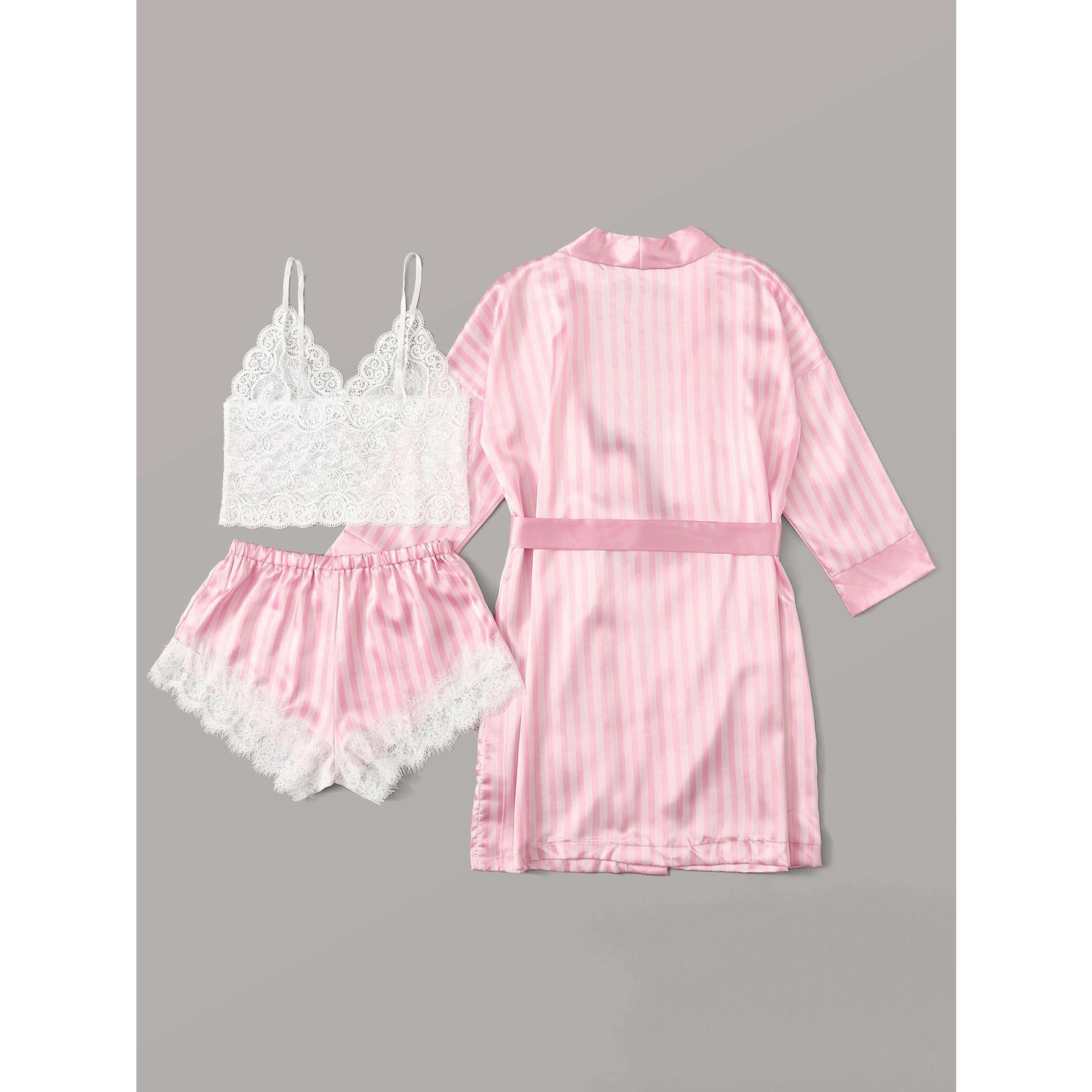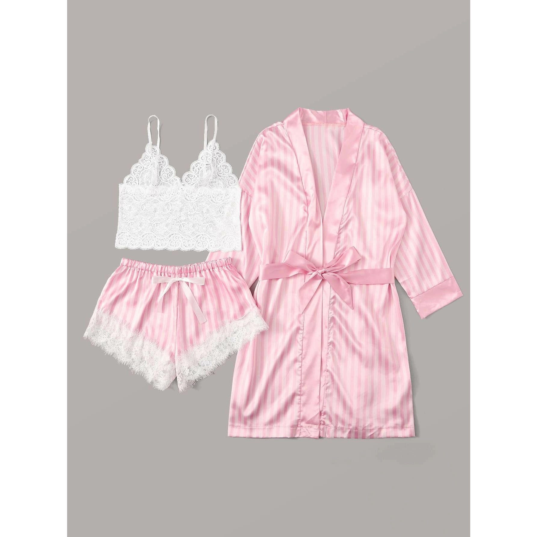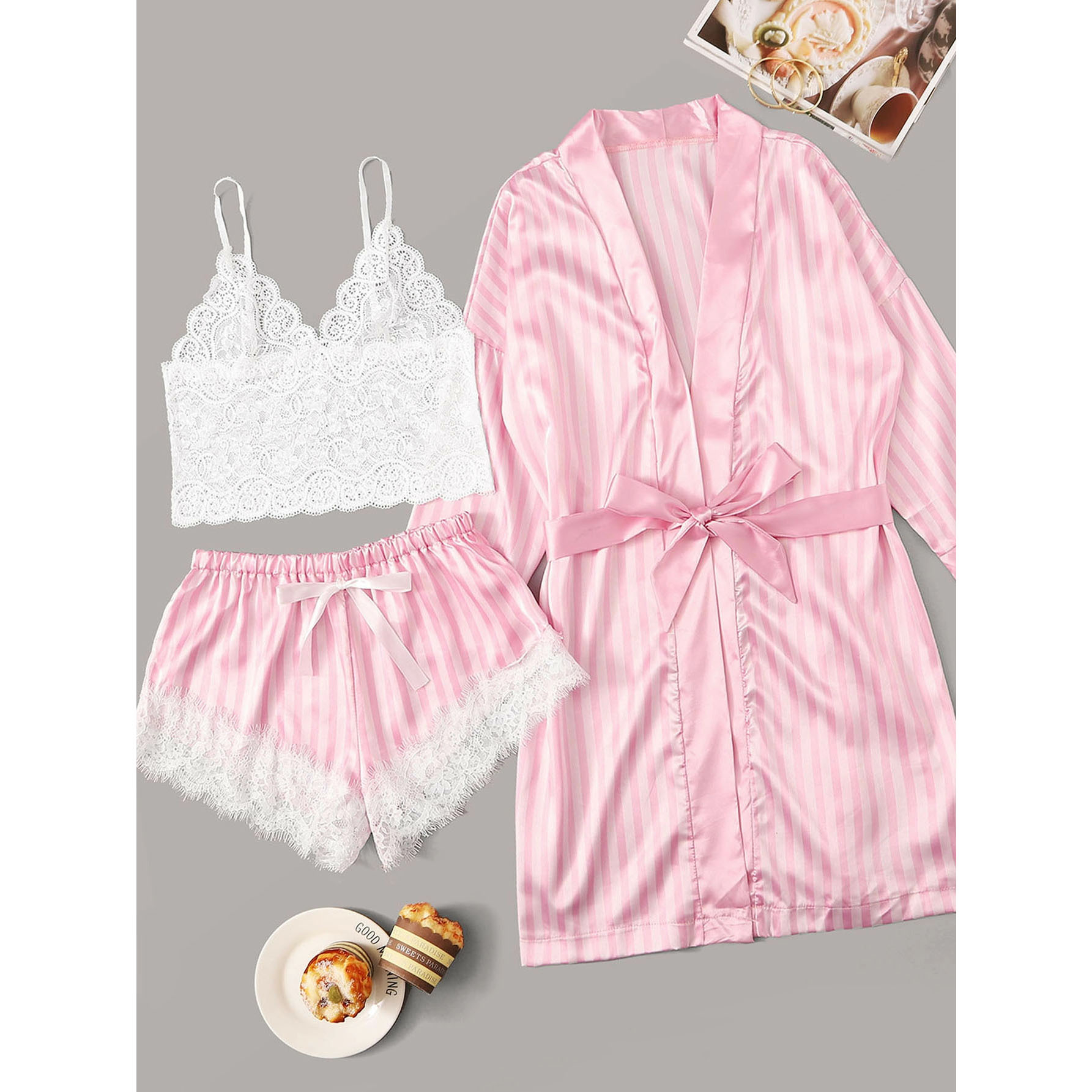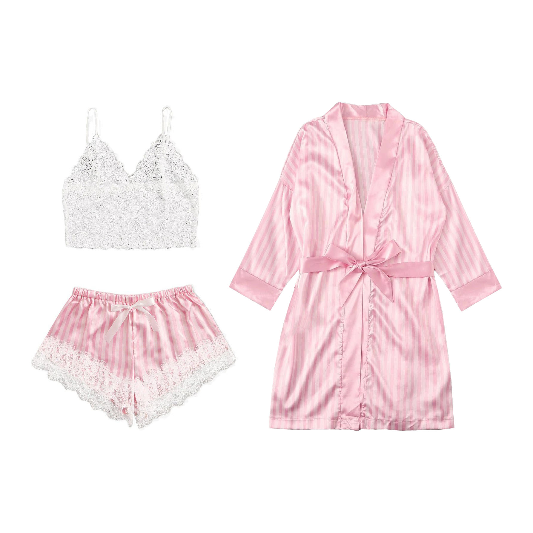 بندهای باریک قابل تنظیم در نیم تنه, رویه ست دارای کمربندی از جنس ساتن, ست لباس خواب زنانه ربدوشامبر به همراه شلوارک ساتن و نیم تنه گیپور بندهای باریک قابل تنظیم در نیم تنه رویه ست دارای کمربندی از جنس ساتن فرم رویه جلو باز, فرم رویه جلو باز |