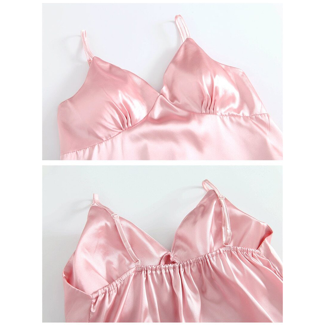 تاپ و پیراهن ساتن آستین حلقه ای یقه هفت, تولید شده با مرغوب ترین ساتن که از نرمی و لطافت خاصی برخوردار است, دارای بند قابل تنظیم در تاپ, ست لباس خواب زنانه تویین, ست لباس خواب زنانه شامل شومیز قیطون دوز, قد تاپ 60 سانتی متر |
